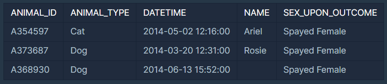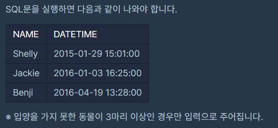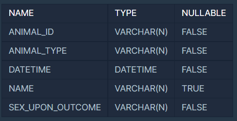 ANIMAL_OUTS 테이블은 동물 보호소에서 입양 보낸 동물의 정보를 담은 테이블입니다. ANIMAL_OUTS 테이블 구조는 다음과 같으며, ANIMAL_ID, ANIMAL_TYPE, DATETIME, NAME, SEX_UPON_OUTCOME는 각각 동물의 아이디, 생물 종, 입양일, 이름, 성별 및 중성화 여부를 나타냅니다. ANIMAL_OUTS 테이블의 ANIMAL_ID는 ANIMAL_INS의 ANIMAL_ID의 외래 키입니다.