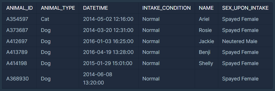 ANIMAL_INS 테이블은 동물 보호소에 들어온 동물의 정보를 담은 테이블입니다. ANIMAL_INS 테이블 구조는 다음과 같으며, ANIMAL_ID, ANIMAL_TYPE, DATETIME, INTAKE_CONDITION, NAME, SEX_UPON_INTAKE는 각각 동물의 아이디, 생물 종, 보호 시작일, 보호 시작 시 상태, 이름, 성별 및 중성화 여부를 나타냅니다.