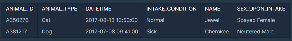 ANIMAL_INS 테이블은 동물 보호소에 들어온 동물의 정보를 담은 테이블입니다. ANIMAL_INS 테이블 구조는 다음과 같으며, ANIMAL_ID, ANIMAL_TYPE, DATETIME, INTAKE_CONDITION, NAME, SEX_UPON_INTAKE는 각각 동물의 아이디, 생물 종, 보호 시작일, 보호 시작 시 상태, 이름, 성별 및 중성화 여부를 나타냅니다.
