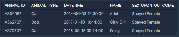 ANIMAL_OUTS 테이블은 동물 보호소에서 입양 보낸 동물의 정보를 담은 테이블입니다. ANIMAL_OUTS 테이블 구조는 다음과 같으며, ANIMAL_ID, ANIMAL_TYPE, DATETIME, NAME, SEX_UPON_OUTCOME는 각각 동물의 아이디, 생물 종, 입양일, 이름, 성별 및 중성화 여부를 나타냅니다. ANIMAL_OUTS 테이블의 ANIMAL_ID는 ANIMAL_INS의 ANIMAL_ID의 외래 키입니다.