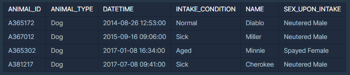 ANIMAL_INS 테이블은 동물 보호소에 들어온 동물의 정보를 담은 테이블입니다. ANIMAL_INS 테이블 구조는 다음과 같으며, ANIMAL_ID, ANIMAL_TYPE, DATETIME, INTAKE_CONDITION, NAME, SEX_UPON_INTAKE는 각각 동물의 아이디, 생물 종, 보호 시작일, 보호 시작 시 상태, 이름, 성별 및 중성화 여부를 나타냅니다.