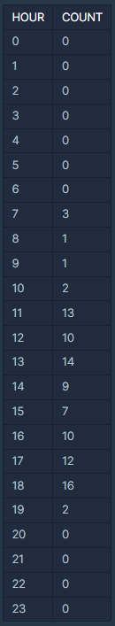 해당 코드에 각 @HOUR에 맞는 HOUR(DATETIME)값을 전체 칼럼에서 COUNT(*)을 하면 된다.