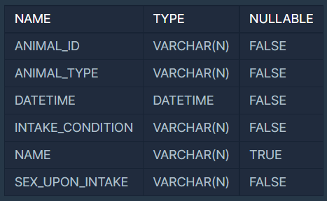 ANIMAL_INS 테이블은 동물 보호소에 들어온 동물의 정보를 담은 테이블입니다. ANIMAL_INS 테이블 구조는 다음과 같으며, ANIMAL_ID, ANIMAL_TYPE, DATETIME, INTAKE_CONDITION, NAME, SEX_UPON_INTAKE는 각각 동물의 아이디, 생물 종, 보호 시작일, 보호 시작 시 상태, 이름, 성별 및 중성화 여부를 나타냅니다.