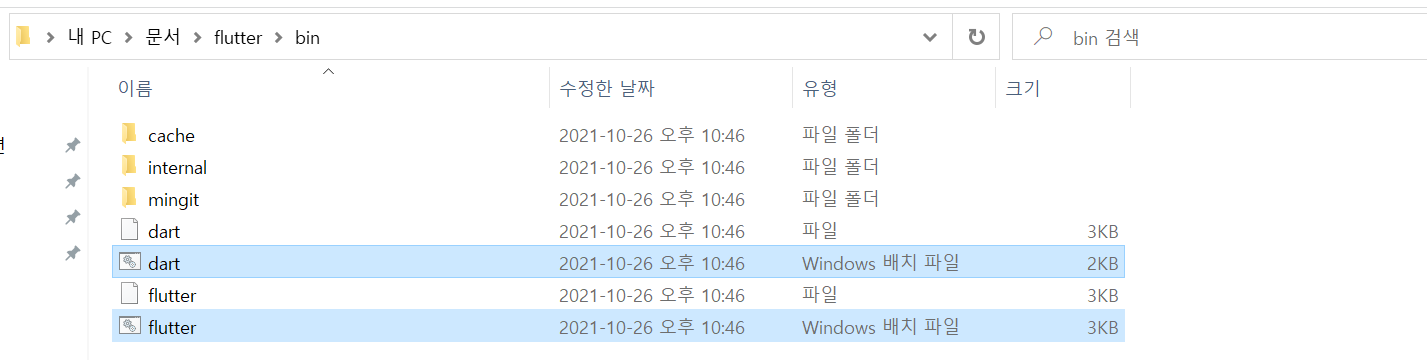 압축을 푼 flutter SDK 내부 파일 중 bin 파일에 들어가면 dart, flutter가 있음을 확인할 수 있다.