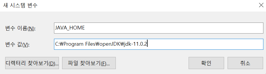 5. 새로 만들기 클릭하여 C:\Program Files\openJDK\jdk-11.0.2\bin 경로 입력
