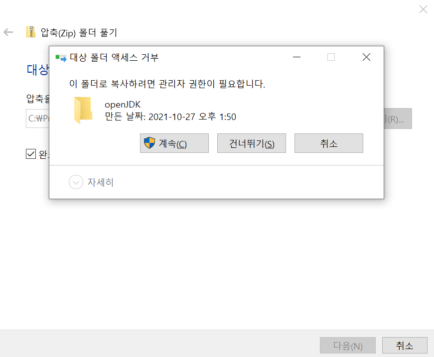 다운 받은 openjdk-11.0.1_windows-x64_bin.zip 압축을 풀 때 C:\ProgramFile 에 java or openJDK 파일을 새로 만들어 해당 파일에 압축 파일 해제한다.