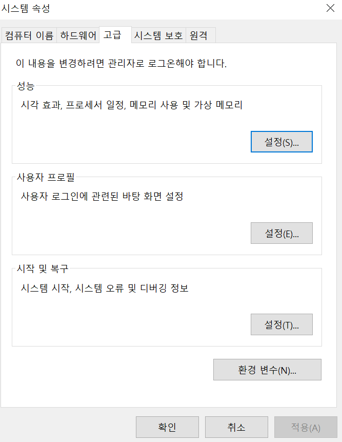 1. 내 PC에서 오른쪽 마우스 클릭한 후 속성 -> 고급 시스템 설정 클릭 -> 환경 변수 클릭