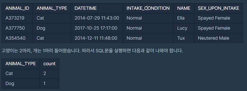 동물 보호소에 들어온 동물 중 고양이와 개가 각각 몇 마리인지 조회하는 SQL문을 작성해주세요. 이때 고양이를 개보다 먼저 조회하자.